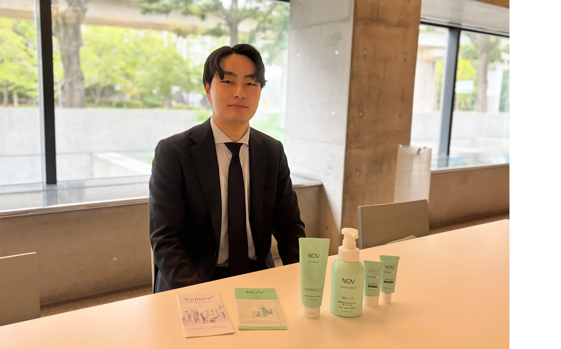 幼い頃から肌が弱く、医療機関で勧められた「NOV」の石鹸を使っていたそうです。肌トラブルで悩んでいた高校生の頃は、「NOV」のスキンケアを愛用していました。自分がお世話になった商品を、今度は営業職として、同じように悩みを抱えている方の手助けができればと思い、志望しました。選考を通じて、商品の良さだけでなく、「NOV」の商品開発へのこだわりや、化粧品の分野で医療機関と密接にかかわる営業スタイルの独自性にも魅力を感じ、入社を決めました。